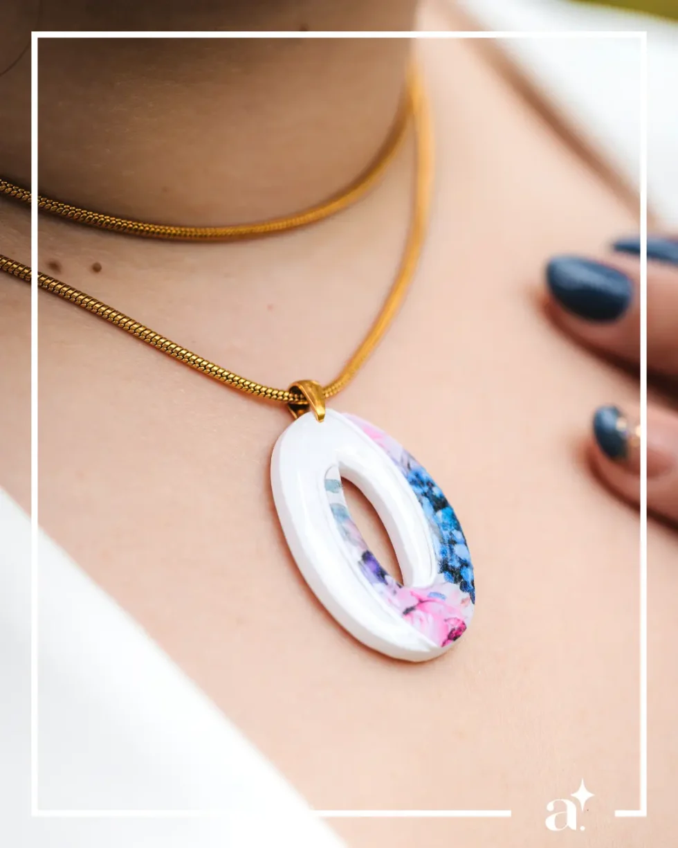 Por ser uma peça artesanal, a disposição do padrão varia — não existem dois colares iguais.